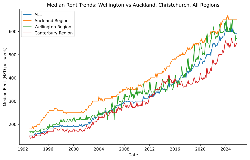 Rental Prices Metrics: New Zealand – Absolute Values (Weekly Median Rent) Regional 1993 to 2025