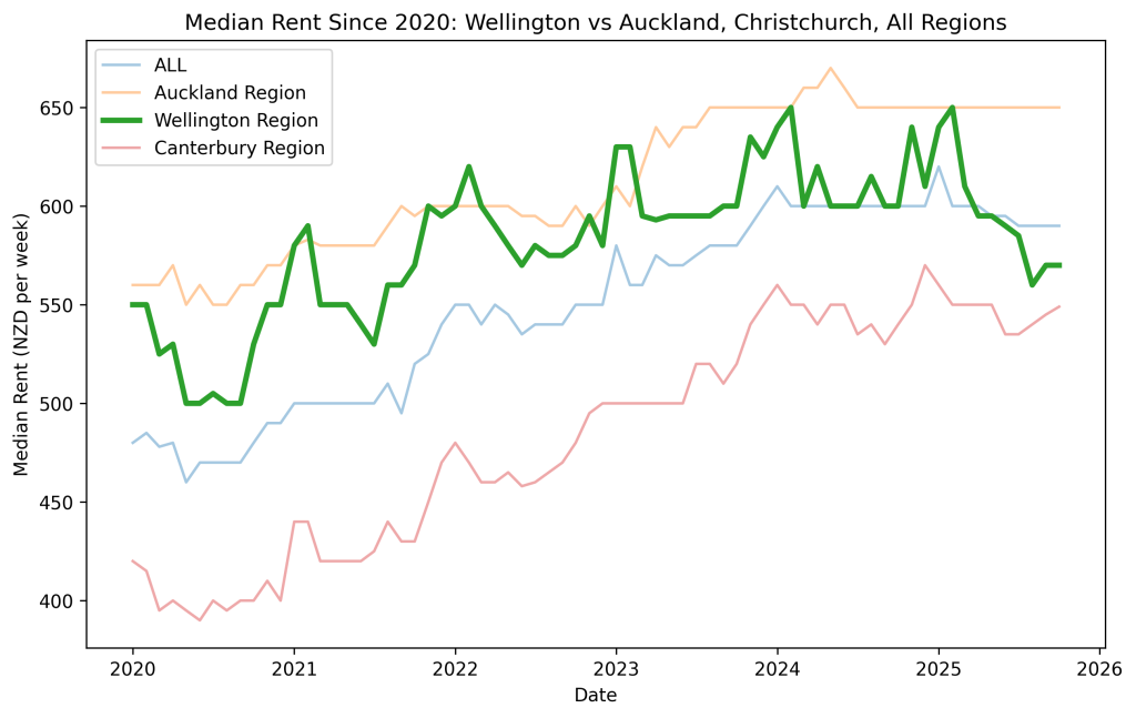 Rental Prices Metrics: New Zealand – Absolute Values (Weekly Median Rent) Regional 2020 to 2025